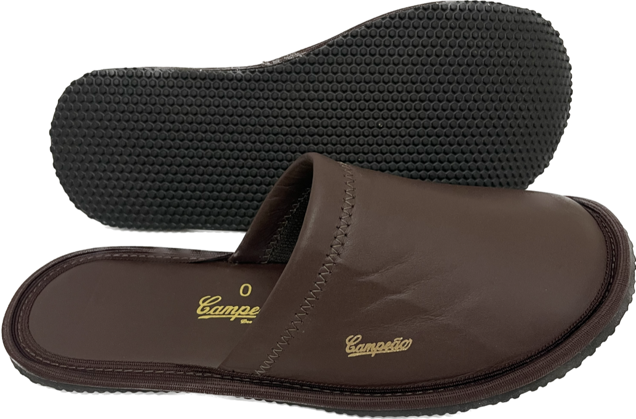 Chinelo de quarto em couro. Cabedal e palmilha acolhoadas, solado em eva.
